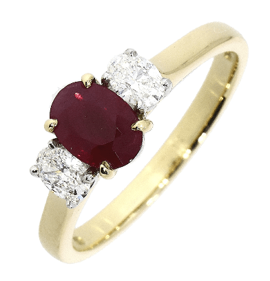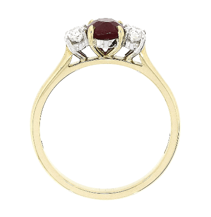 Oval cut ruby set in 18ct yellow gold, adorned with two oval diamonds set in 18ct white gold, with an 18ct yellow gold band.