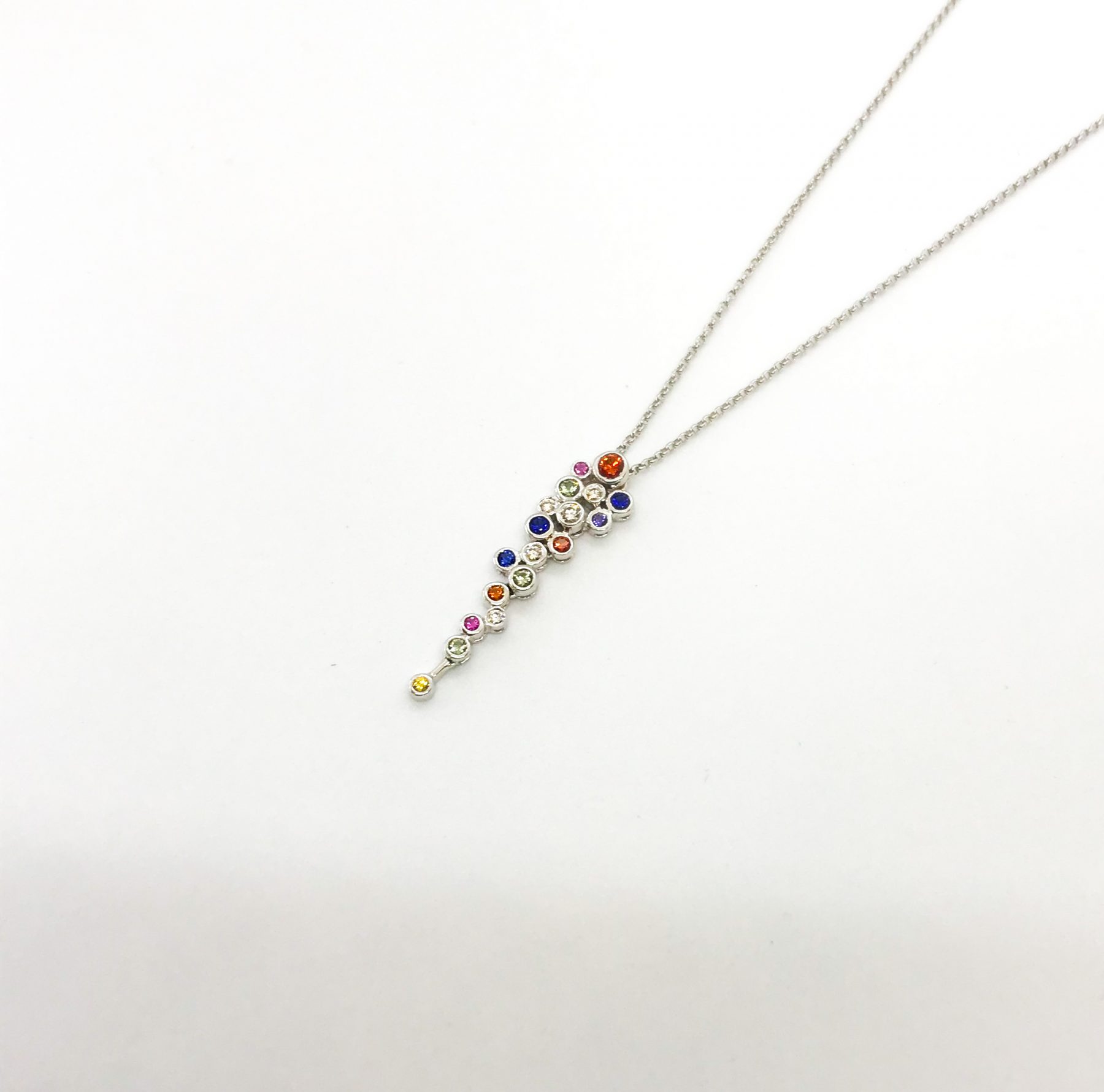 Elegant and feminine, this 18ct white gold necklace features a sequence of multi-coloured sapphires, and brilliant cut diamonds, which are elegantly set in this bubble-like design.
