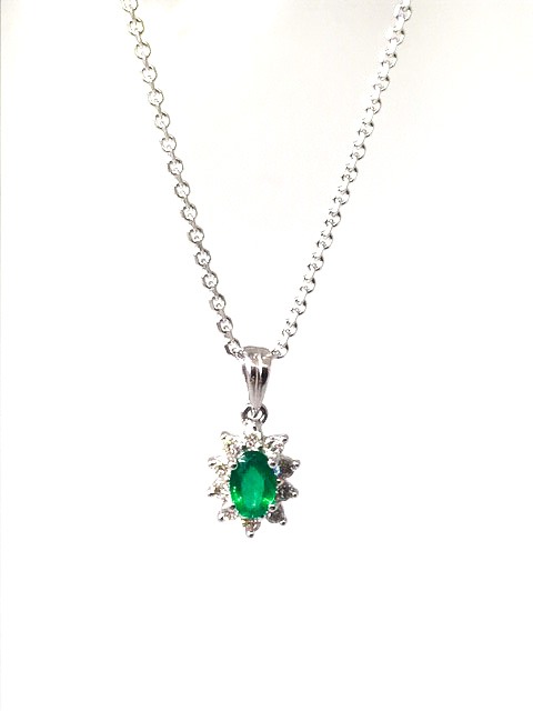 18ct White Gold Oval Emerald & Diamond Cluster Necklace