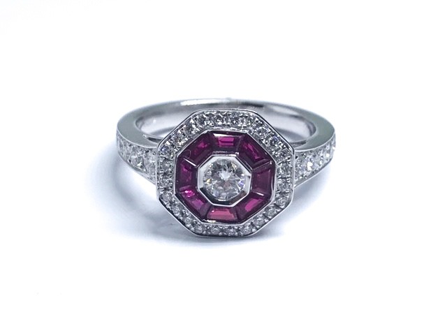 Ruby and Diamond art deco shield design ring, set in 18ct white gold with a diamond set band.