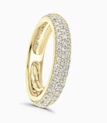 Eternity ring featuring three ergonomic spring arms neatly tucked away through its lining to adapt with changes in your finger for up to 4 full sizes. Shown here with pave set round brilliant diamonds. Total carat weight 1.50ct.