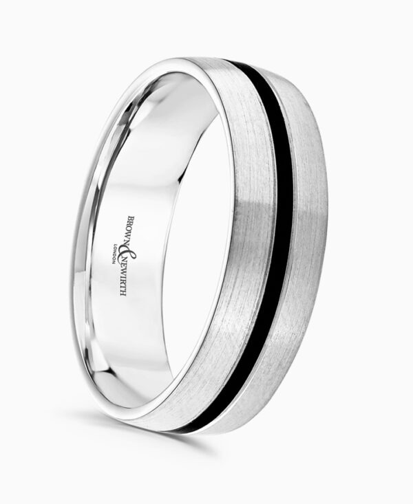 Handcrafted by Brown & Newirth; our modern court profile with rolled black ceramic inlay in a brushed finish, presented in a light gauge.