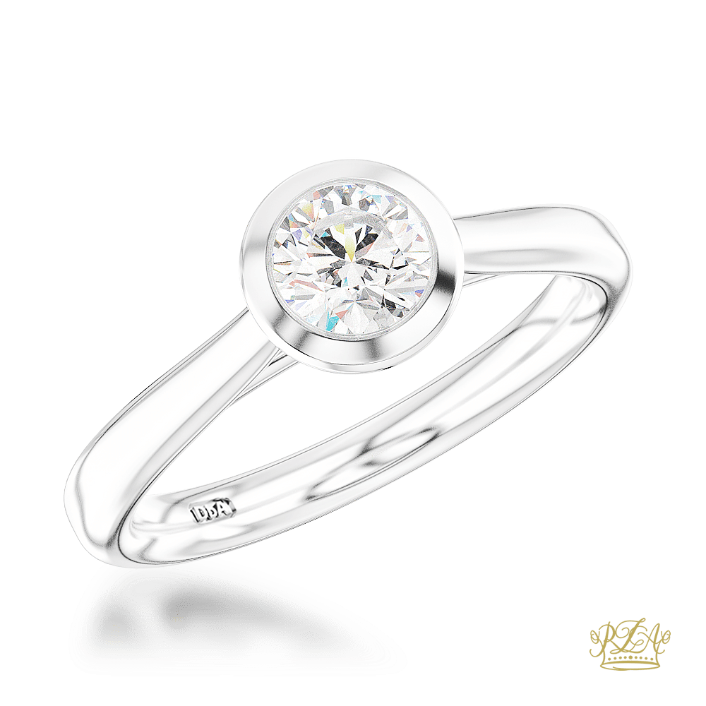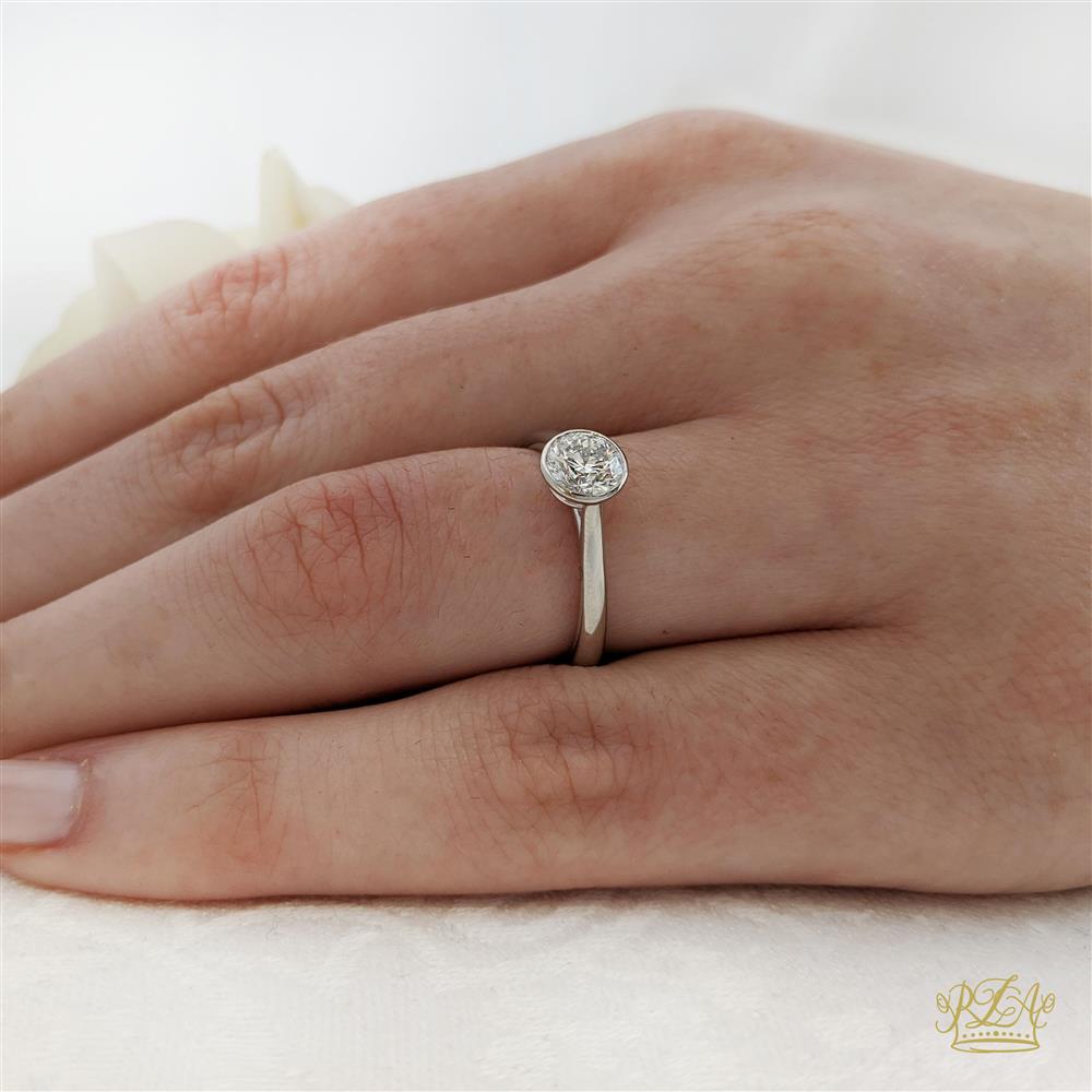 A stunning Round brilliant cut diamond set into rubbed over collet with a hidden diamond in the bridge of the band. Classic and elegant