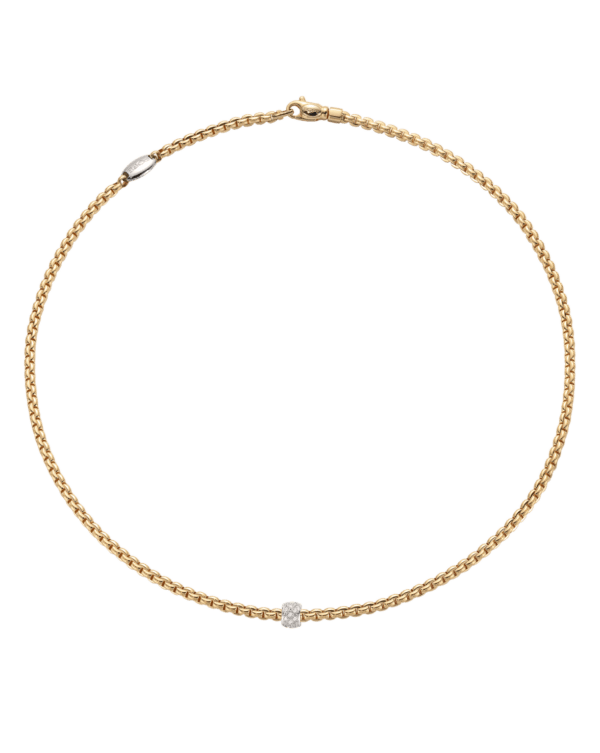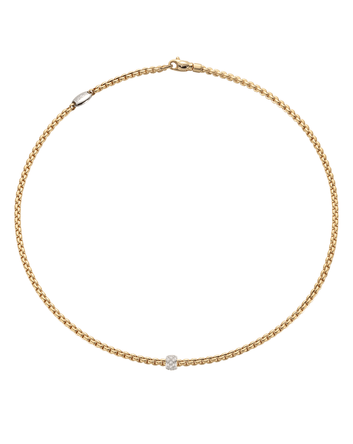 FOPE Eka Tiny Necklace is made from 18ct gold and features a pave set diamond centre piece. This elegant jewellery collection is extremely easy to wear and quintessentially Fope.