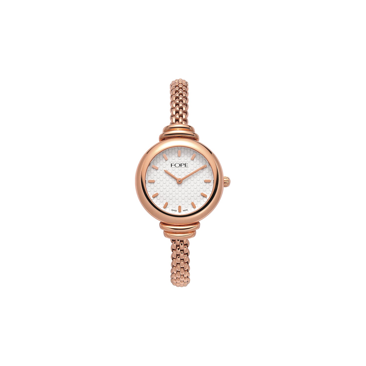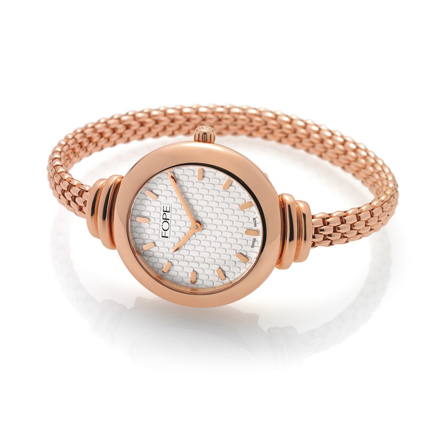 Swiss-made watch featuring a quartz movement and a flexible bracelet entirely made of 18 carat rose gold (case diameter 32mm) every piece of FOPE jewellery is checked meticulously from colour and design.