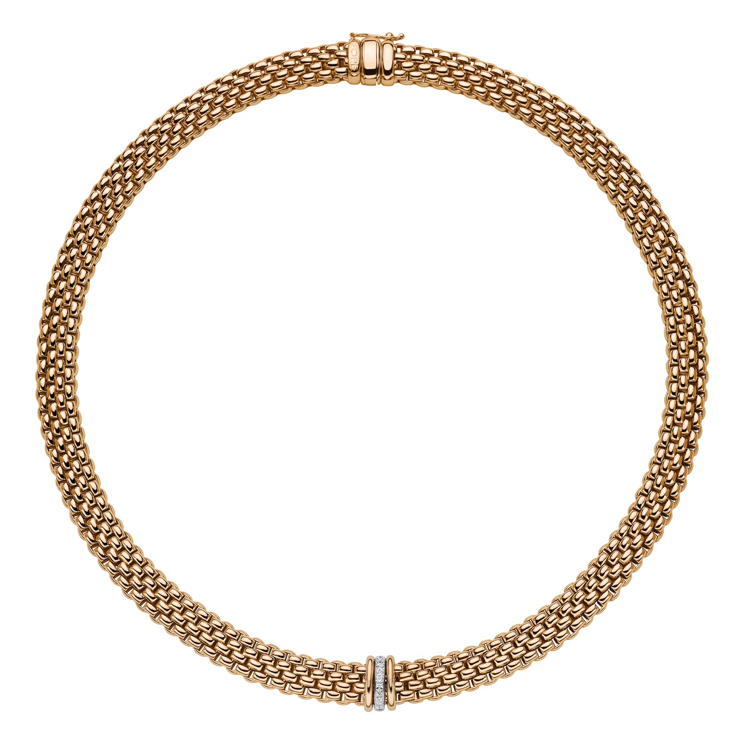 The 18 carat gold mesh features the FOPE signature Novecento style with a wider and finer chain which provides a new feel on the skin.