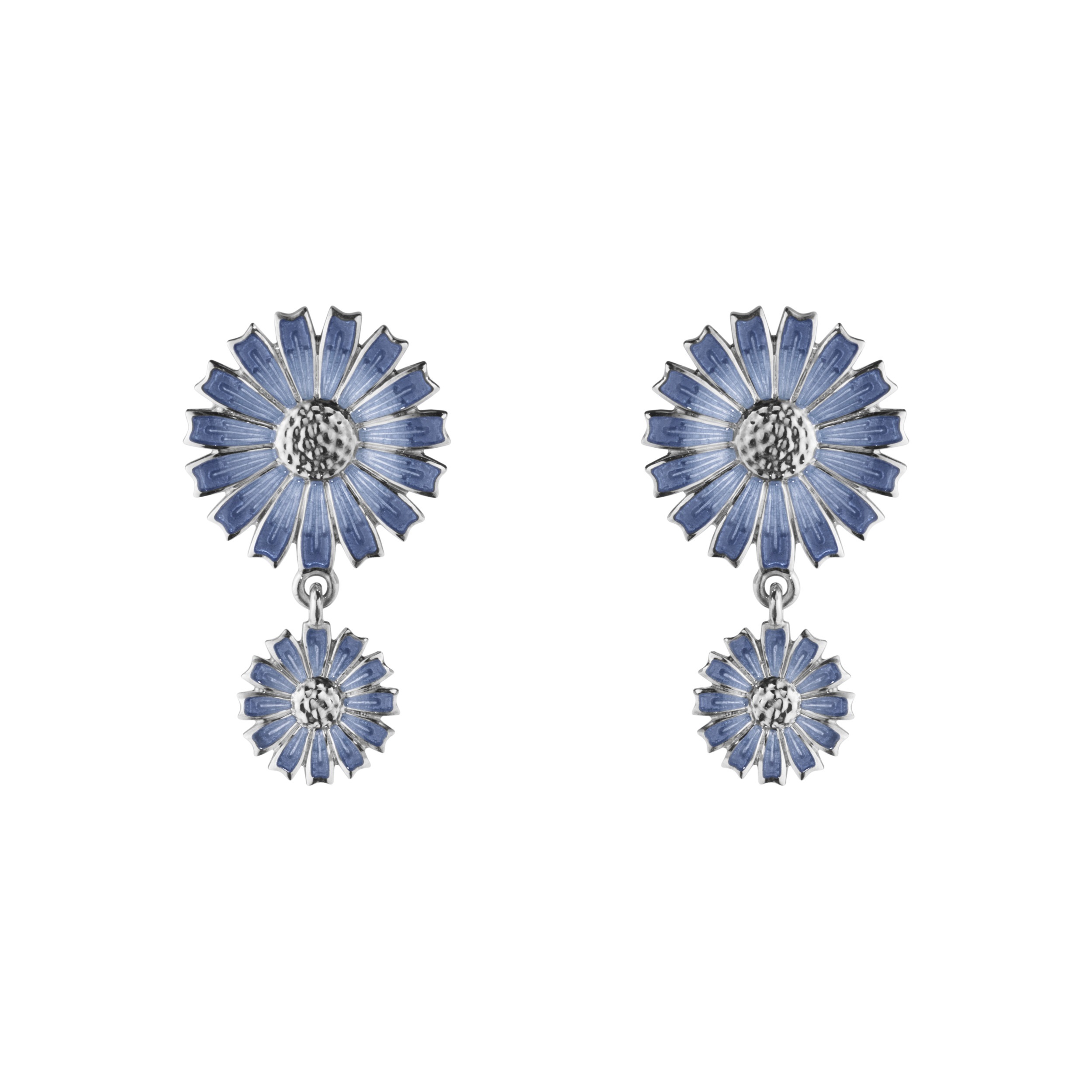 Two dangling daisies in different sizes give life to these beautiful sterling silver earrings. Hand-plated in blue enamel, the pieces feature a slightly reworked design of the classic Georg Jensen motif. The earrings reference a 1940s daisy-shaped brooch gifted to HM Queen Margrethe II of Denmark