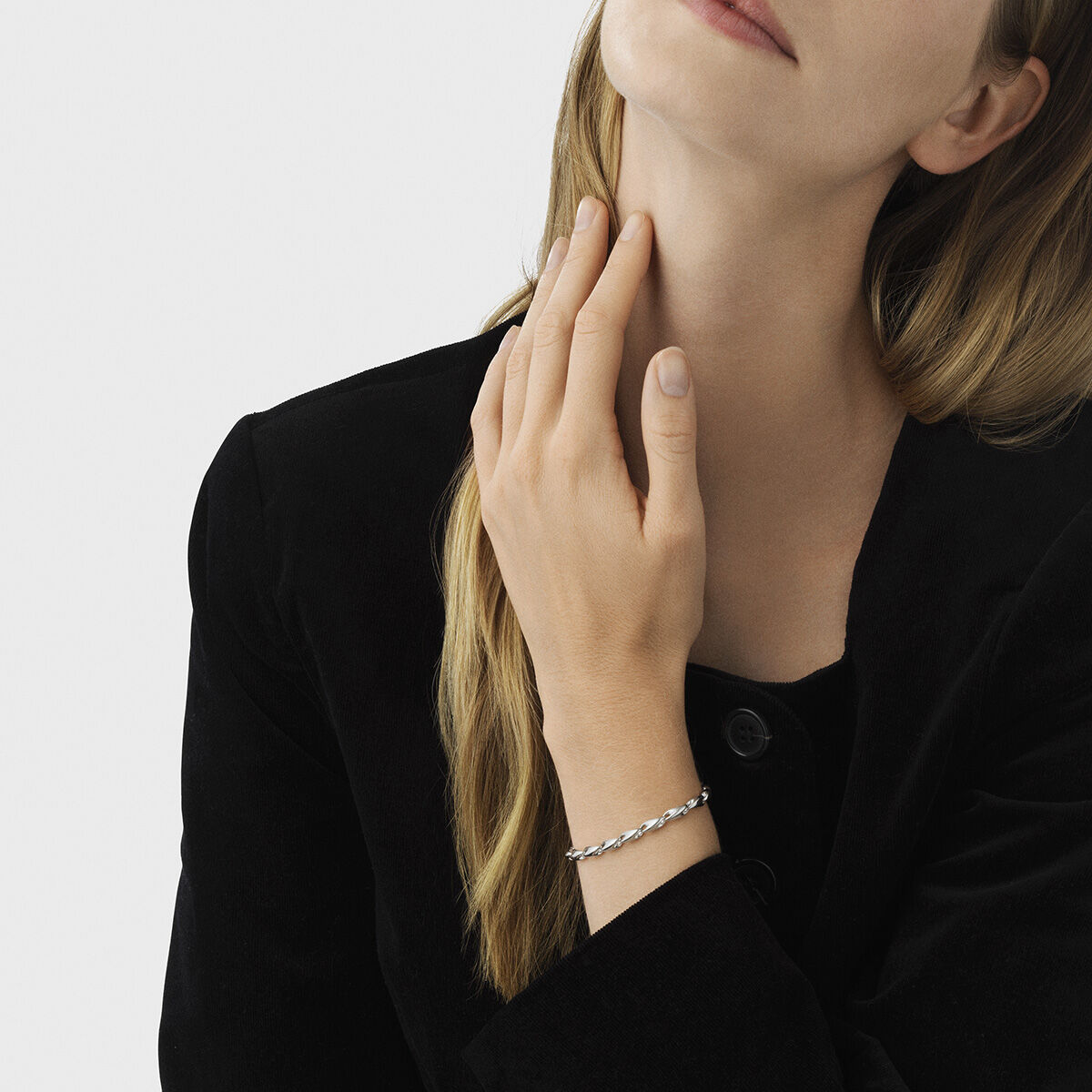 A series of organic-shaped sterling silver links seamlessly come together to create this contemporary take on the traditional chain bracelet. Designed by Jacqueline Rabun and crafted from sterling silver, the bracelet combines a bold look with Georg Jensen’s sculptural design language. The bracelet is fastened by an integral clasp.