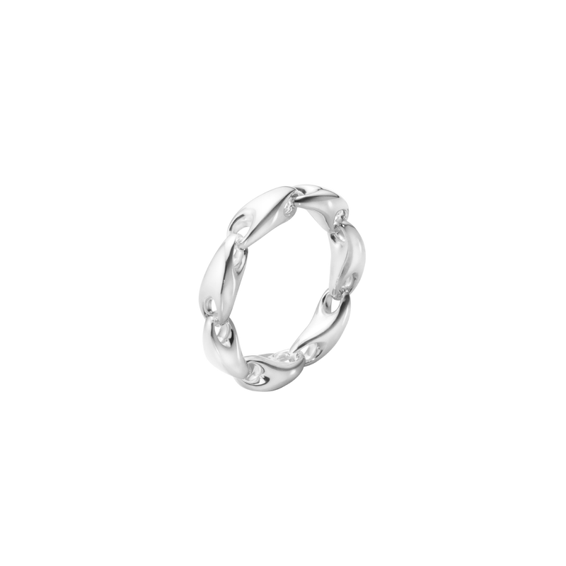 Presenting a reinterpretation of the traditional chain design, Jacqueline Rabun created this contemporary ring as a piece that celebrates individuality. Here, a series of organically shaped sterling silver links give the impression of fluid movement while the ring remains rigid.