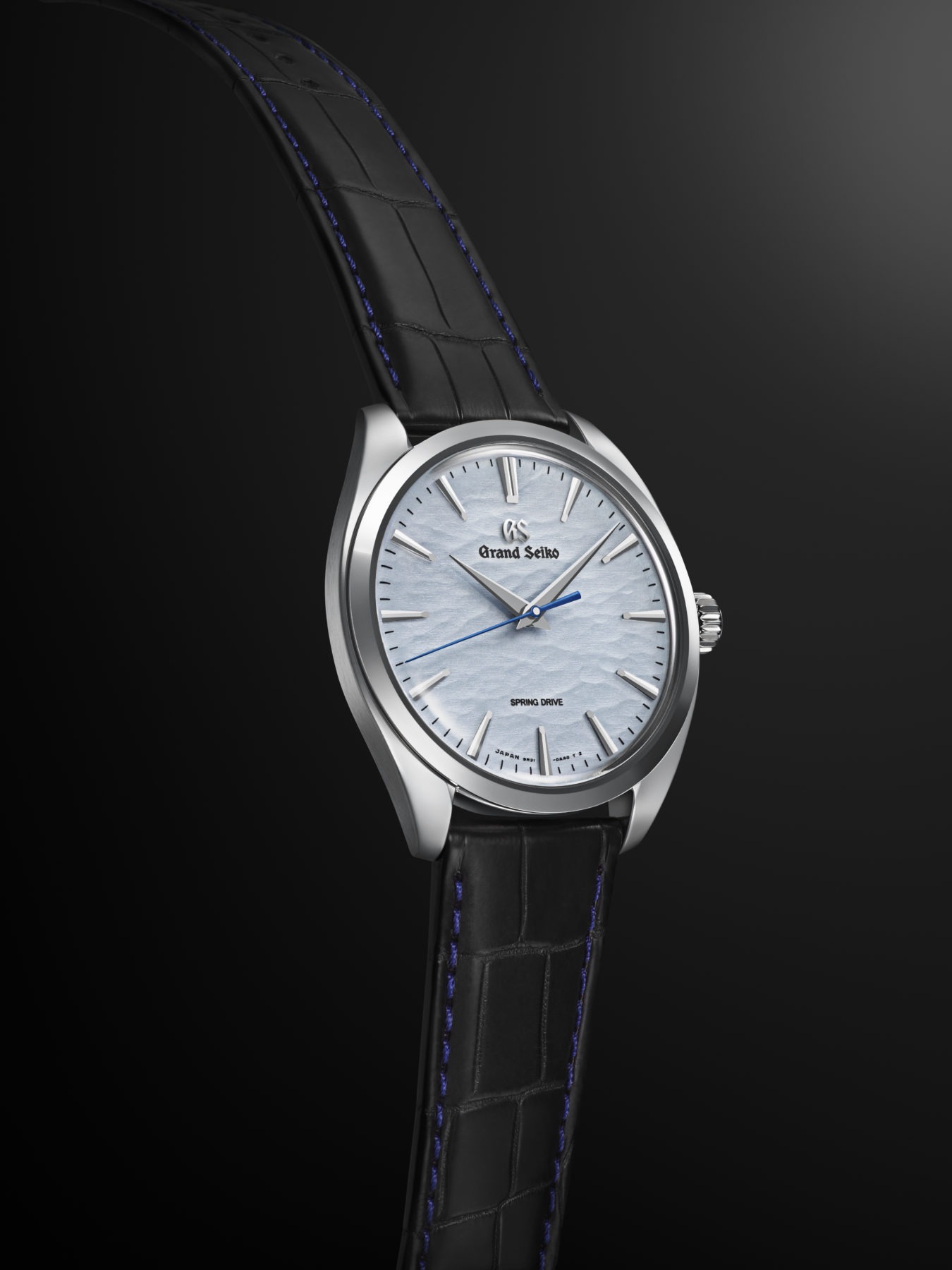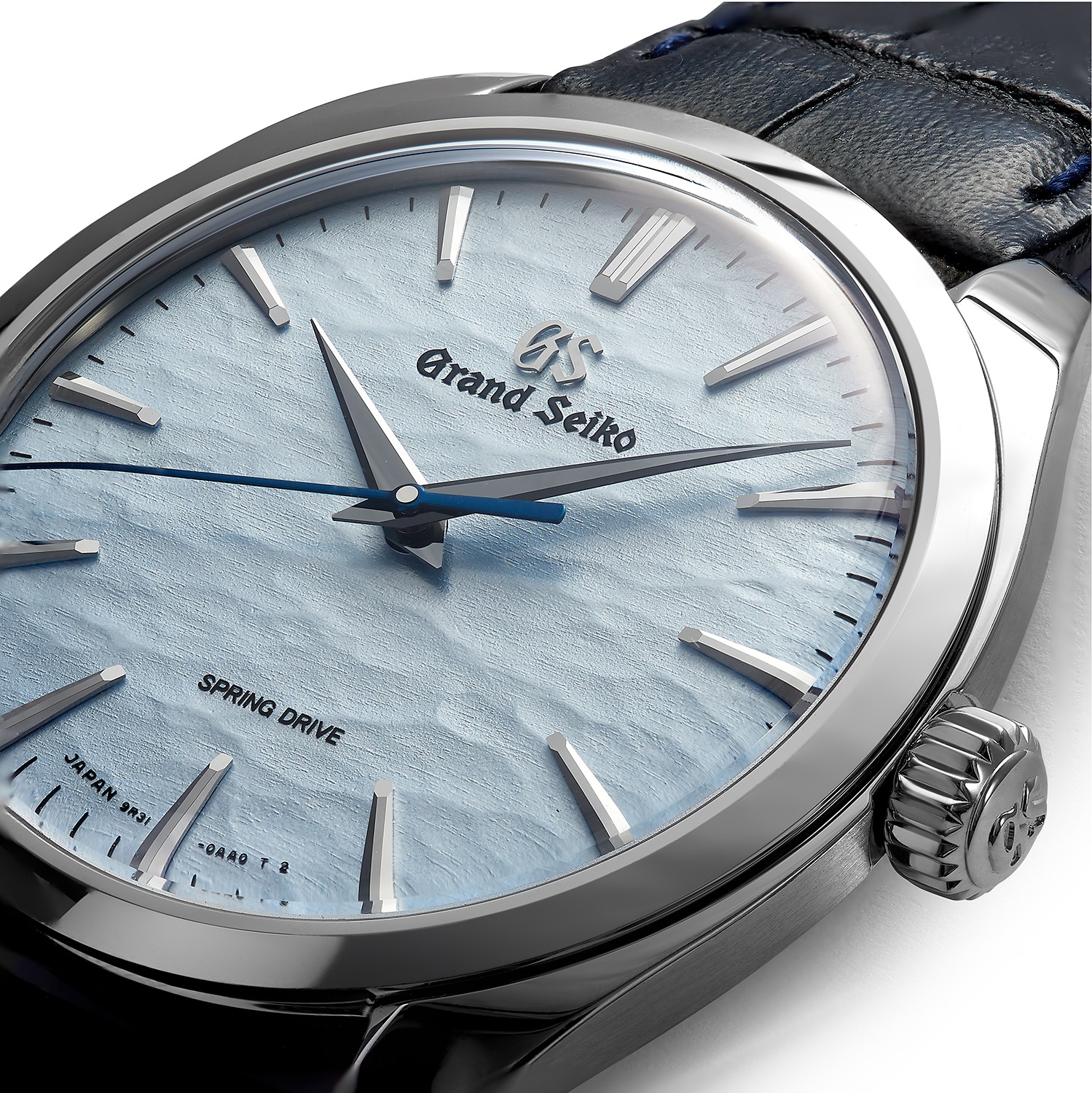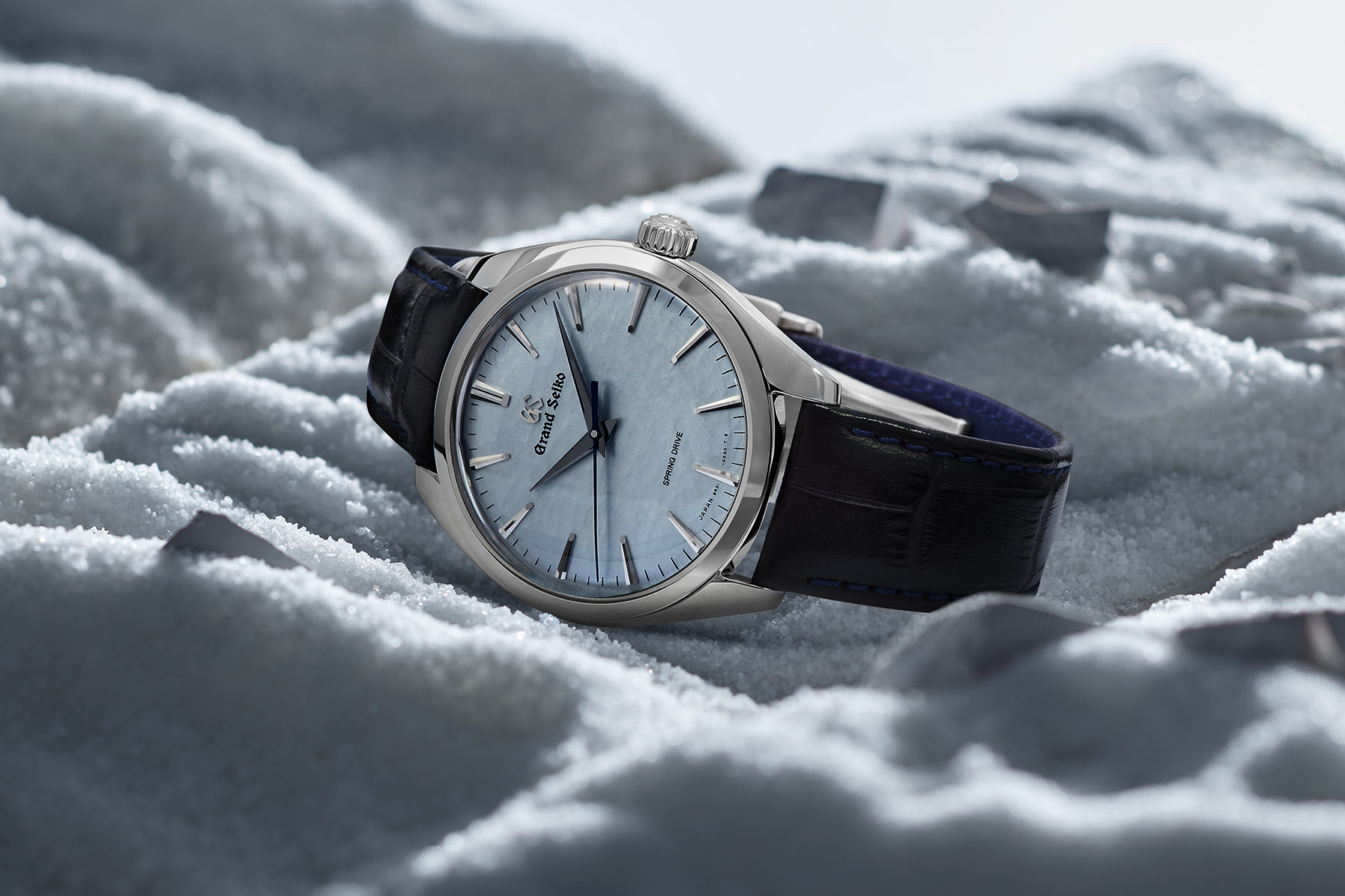 The light blue textured dial of this timepiece is inspired by a mysterious natural midwinter phenomenon called “Omiwatari” occurring on the frozen surface of Japan’s Lake Suwa near Shiojiri, birthplace of Grand Seiko’s Spring Drive movement.