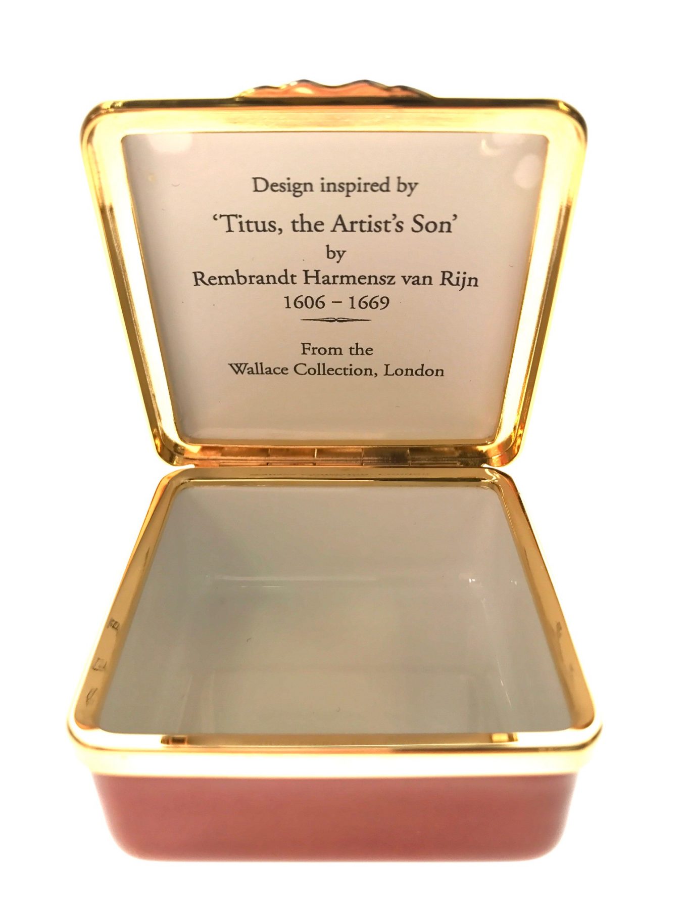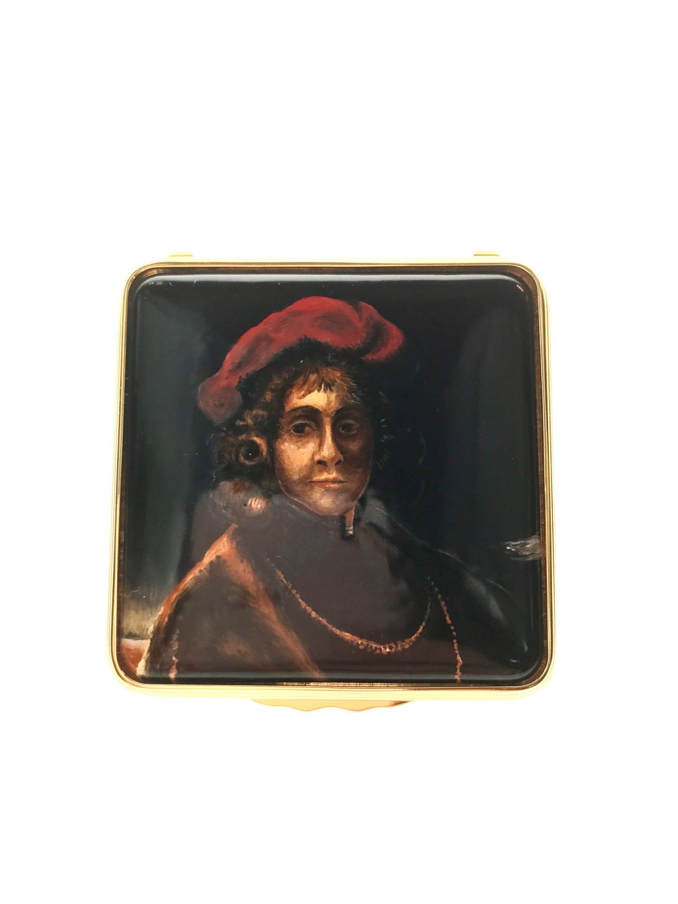 Exquisitely hand pained on this box is Titus, son of Rembrandt. Titus (1641-68) was the only one of Rembrandt’s four children with his first wife, Saskia, to survive infancy. He was 16 when this portrait was painted yet, rather than creating an image of a carefree teenager, Rembrandt has shown him as a serious young man.