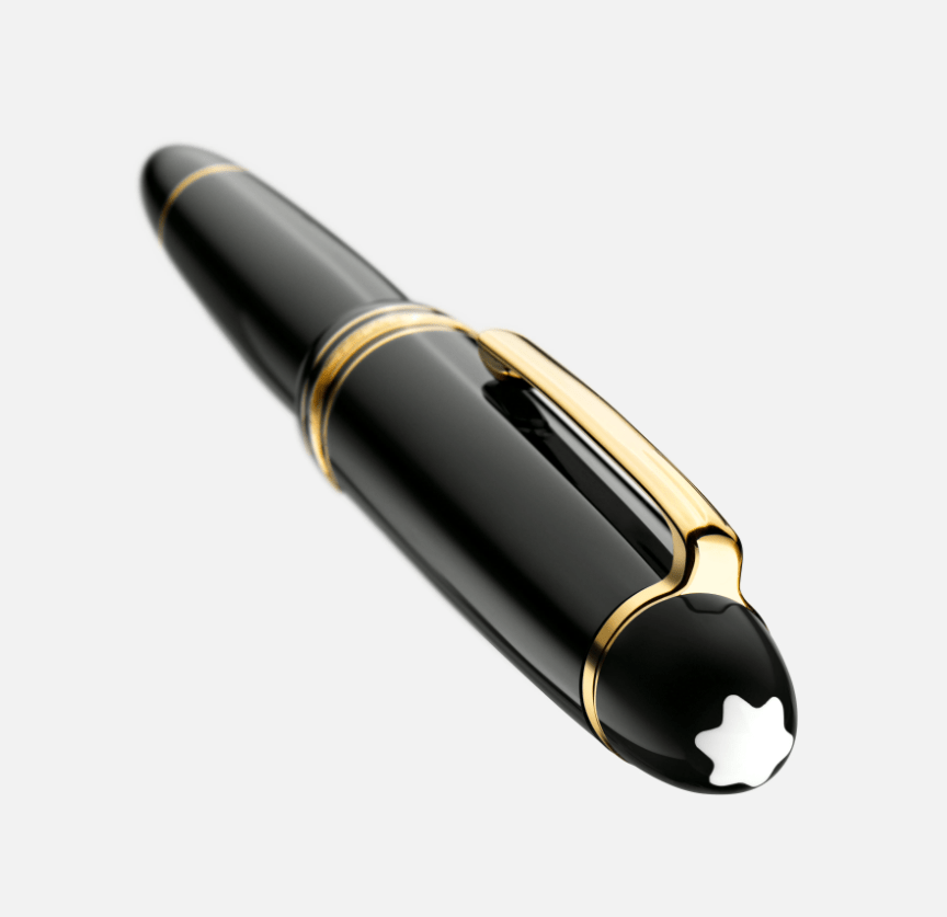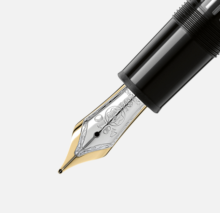 The cap and barrel are crafted in black precious resin featuring the iconic white Montblanc emblem inlaid in the cap top. The fountain pen is adorned with a hand-crafted Au750/18K solid gold nib, rhodium-coated.