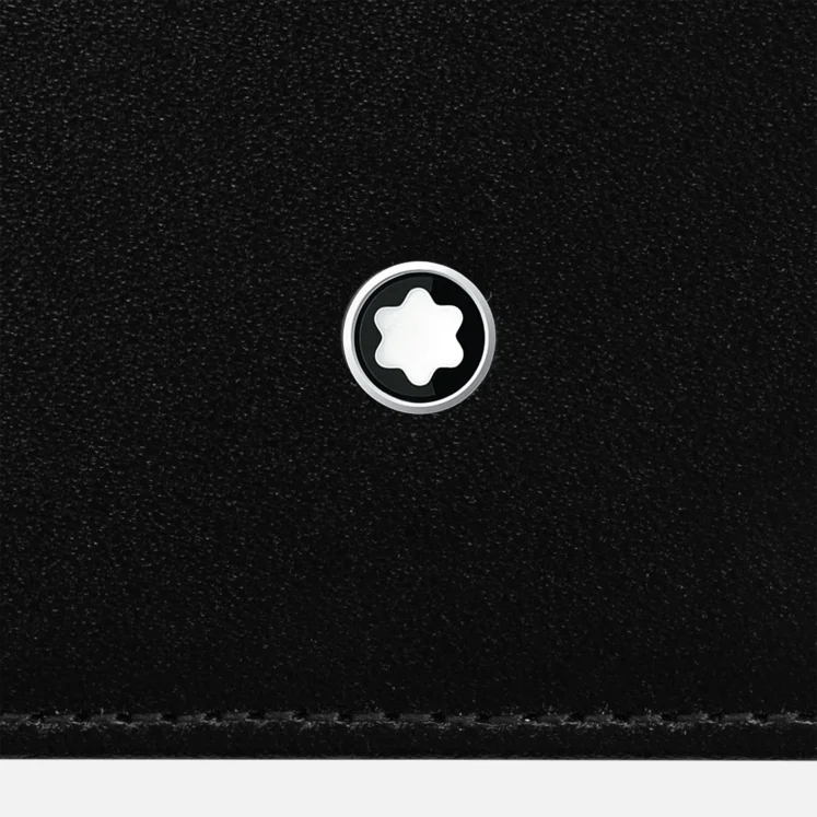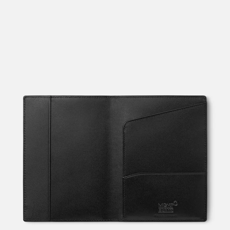 International passport holder made of black full-grain cowhide with Montblanc deep shine, jacquard lining with Montblanc brand name, and a Montblanc emblem with palladium finish ring, with pocket suitable for all international passports and additional pocket.