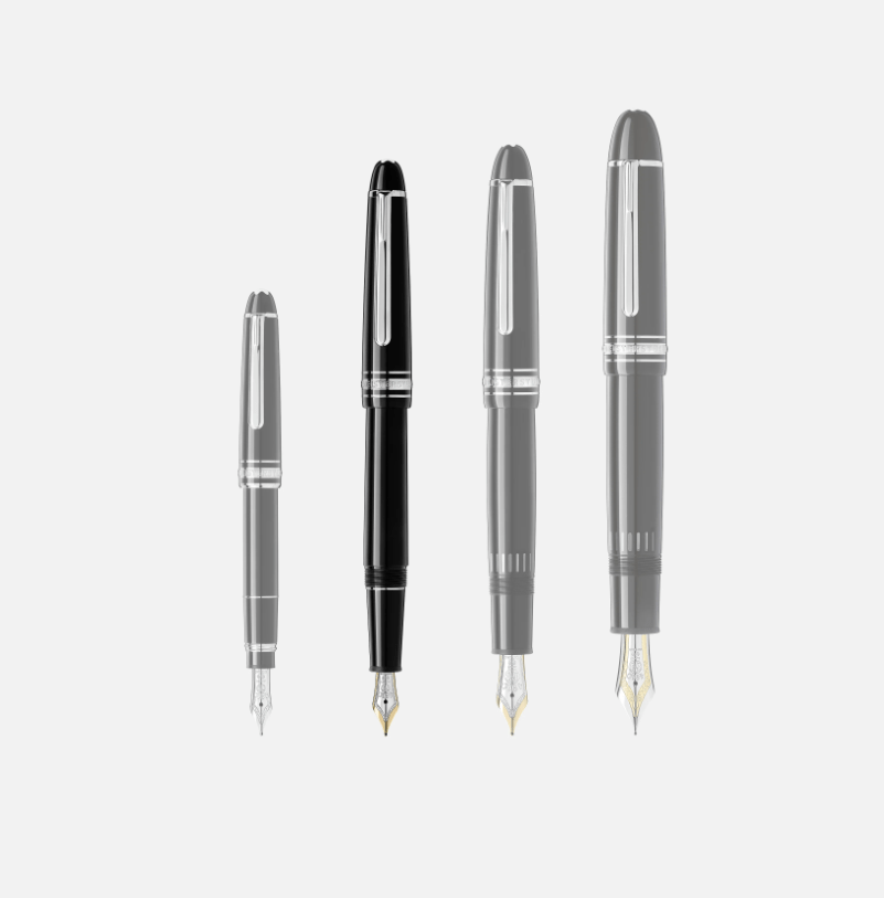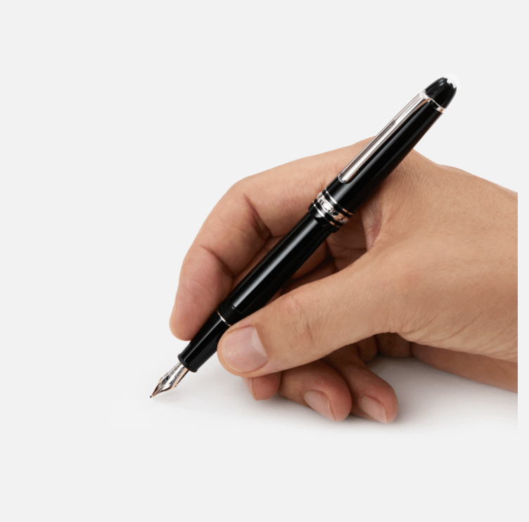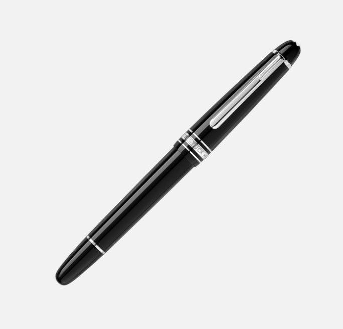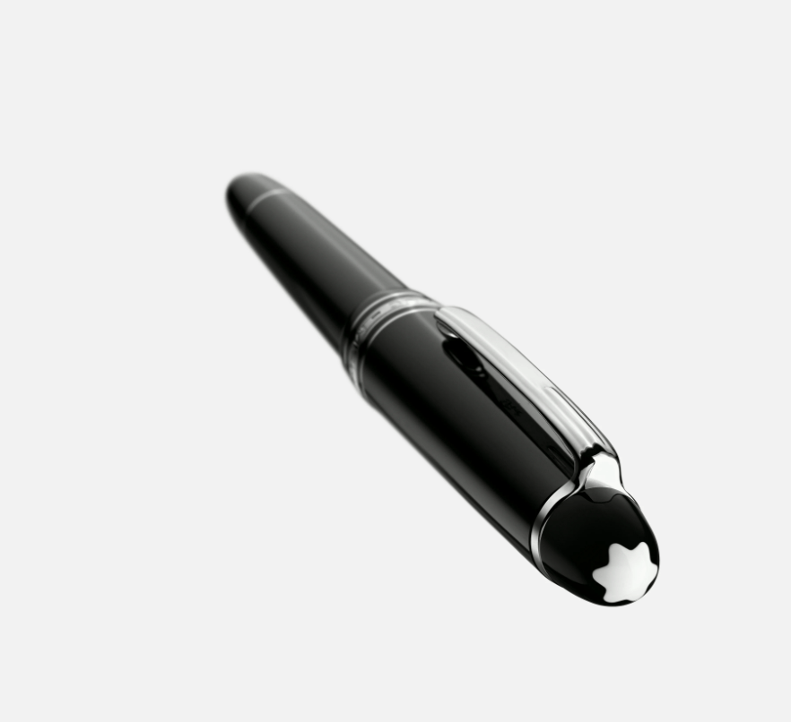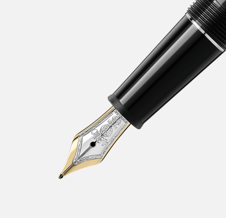 The cap and barrel are crafted in black precious resin featuring the iconic white Montblanc emblem inlaid in the cap top. The fountain pen is adorned with a hand-crafted Au585/14K solid gold nib, rhodium-coated.