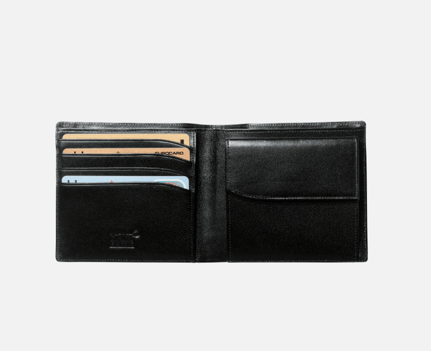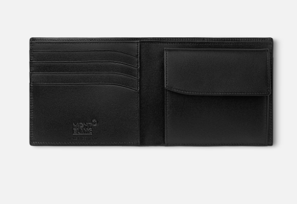 Wallet 4cc, made of black full-grain cowhide with Montblanc deep shine, jacquard lining with Montblanc brand name, Montblanc emblem with palladium finish ring, with 4 pockets for credit cards, 2 compartments for banknotes, flap coin case