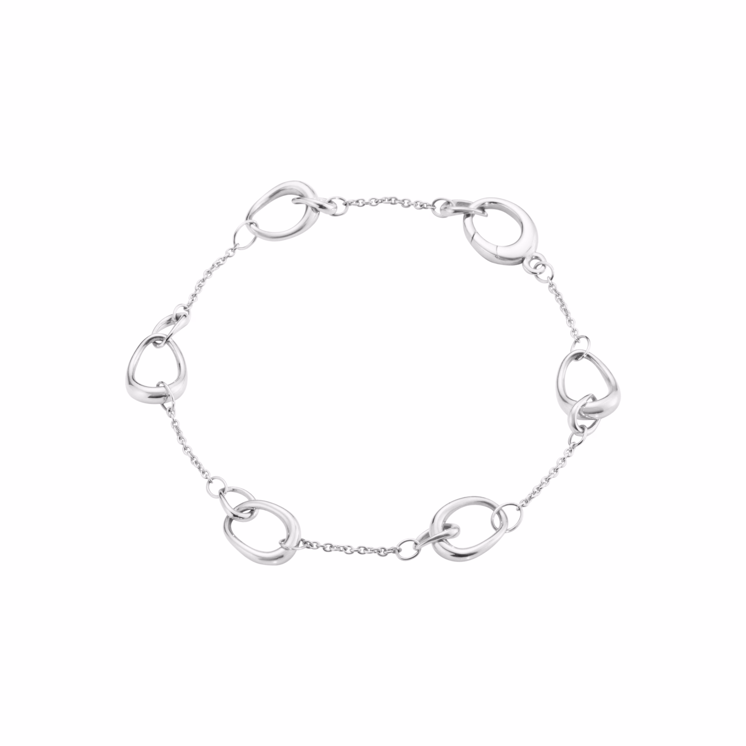 This bracelet is part of Jacqueline Rabun’s Offspring collection. The simplicity of the design comprises a string of larger silver loops interspersed with delicate chain links. Its form is imbued with profound symbolism; interlocking elements represent the strength of emotional bonds that bind together human relationships.