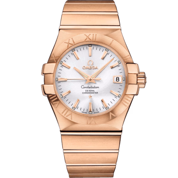 This model features a silver dial with a date window at the 3 o’clock position and a scratch-resistant sapphire crystal. The bezel, with its engraved Roman numerals, is mounted on a 35 mm 18K red gold case, and is presented on an 18K red gold bracelet.