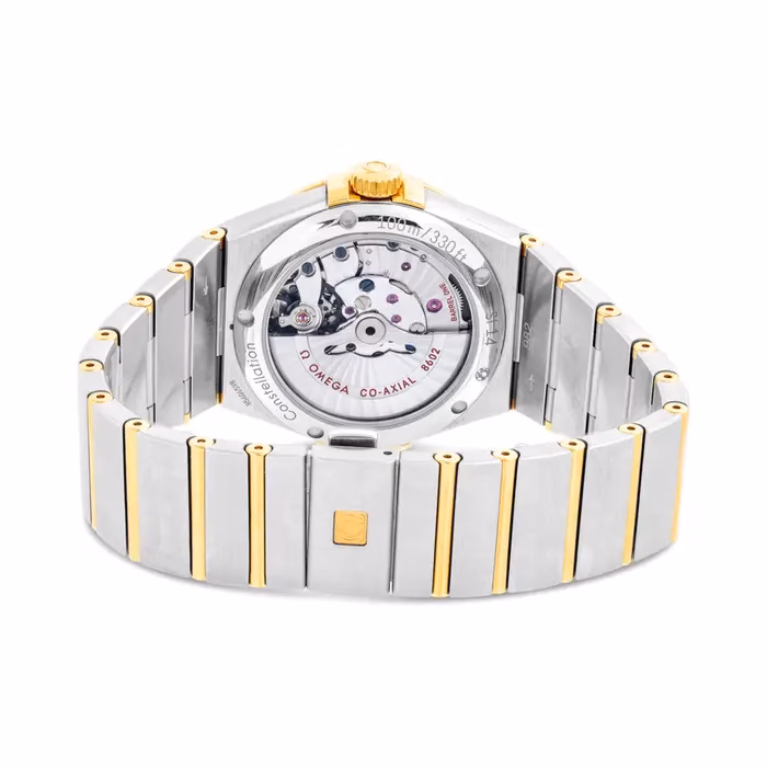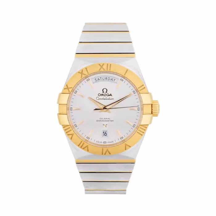 This model features a silver dial with day and date windows at the 12 and 6 o’clock positions, and a scratch-resistant sapphire crystal. The 18 carat yellow gold bezel, with its engraved Roman numerals, is mounted on a 38 mm stainless steel case body and is presented on a stainless steel and 18 carat yellow gold bracelet. Visible through the transparent case back is the OMEGA Co-Axial calibre 8602 within.