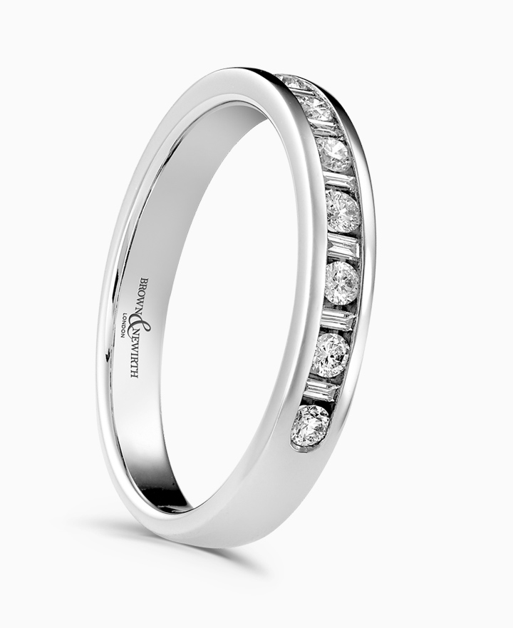 Handcrafted by Brown & Newirth; a captivating mix of baguette & round brilliant diamonds adorn 45% of this square edged band. Total 0.20ct.