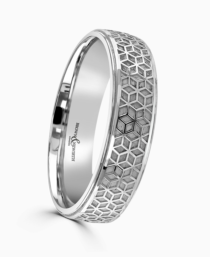 Handcrafted by Brown & Newirth; Wedding ring featuring tessellating 3D cube pattern through it’s width, framed with softened step edges