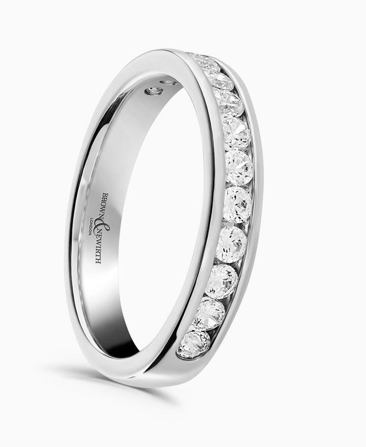 Handcrafted by Brown & Newirth; round brilliant cut diamonds adorn 50% of this straight edged band. Total carat weight 0.50ct. Available in platinum & 18ct yellow gold.