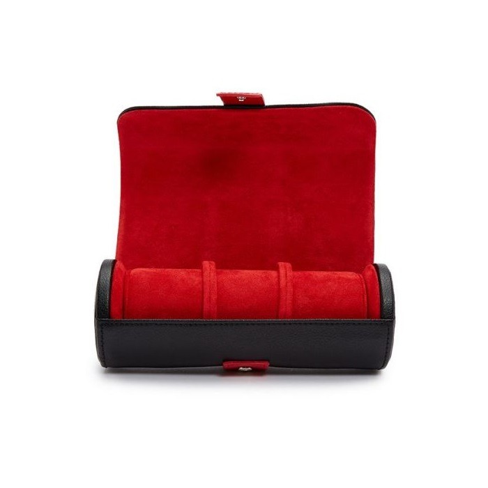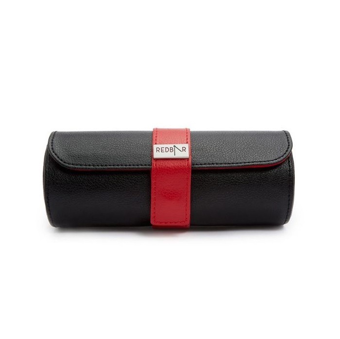 WOLF and RedBar have partnered on a limited edition collection unlike any other. Our watch roll is hand crafted in black & red vegan pebble leather with red lining. Tonal stitching to match vegan leather surface. Chrome enamelled RedBar plaque branded. Patented Watch Guards to keep your timepieces protected while traveling. Includes space for approximately 3 watches with 2 Watch Guards and snap closure.