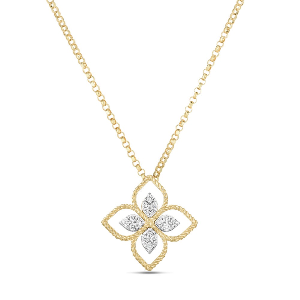 Diamonds illuminate the centre of this special flower pendant by Roberto Coin, featuring 18ct gold and the uniqueness of an handmade jewel. Available in yellow, white and rose gold.