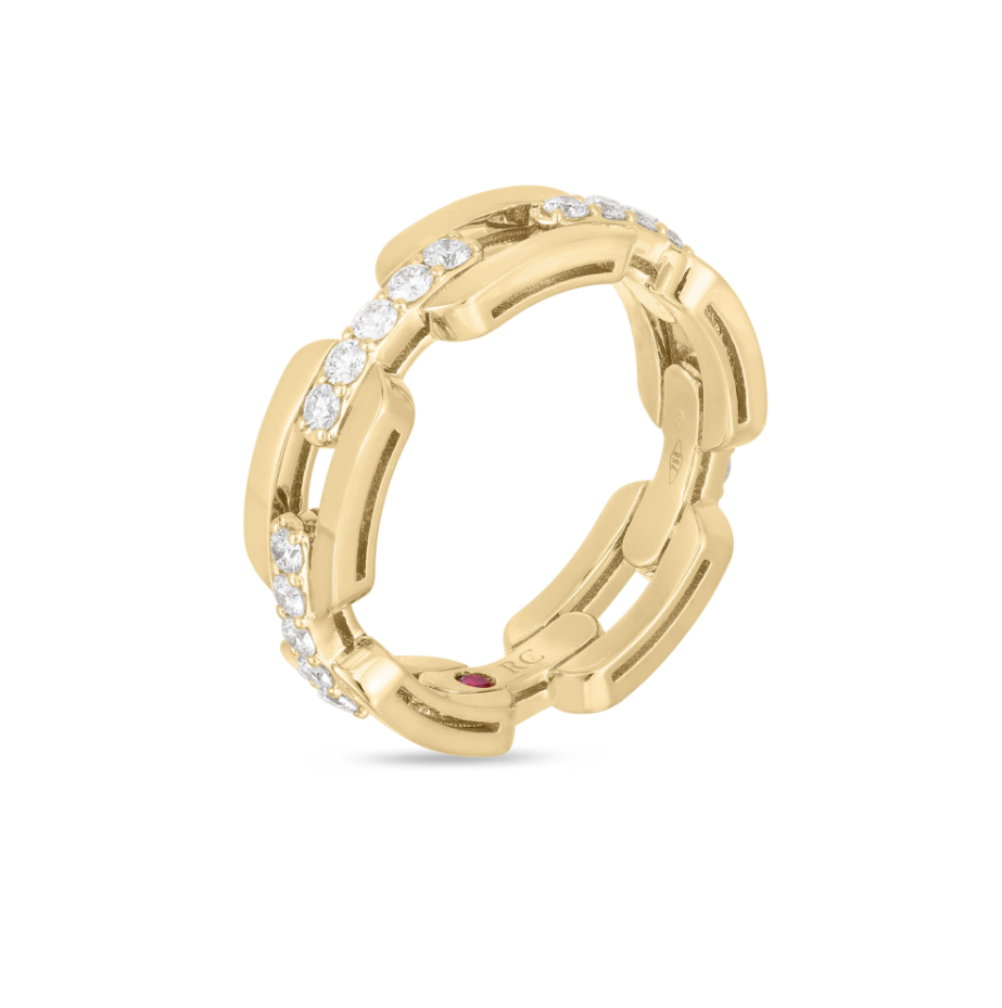 Every piece of Roberto Coin jewellery is set with a small ruby on the inside of each design. The Roberto Coin Navarra Gold and Diamond Ring features 18ct yellow gold with 0.46ct of diamonds and a signature ruby.