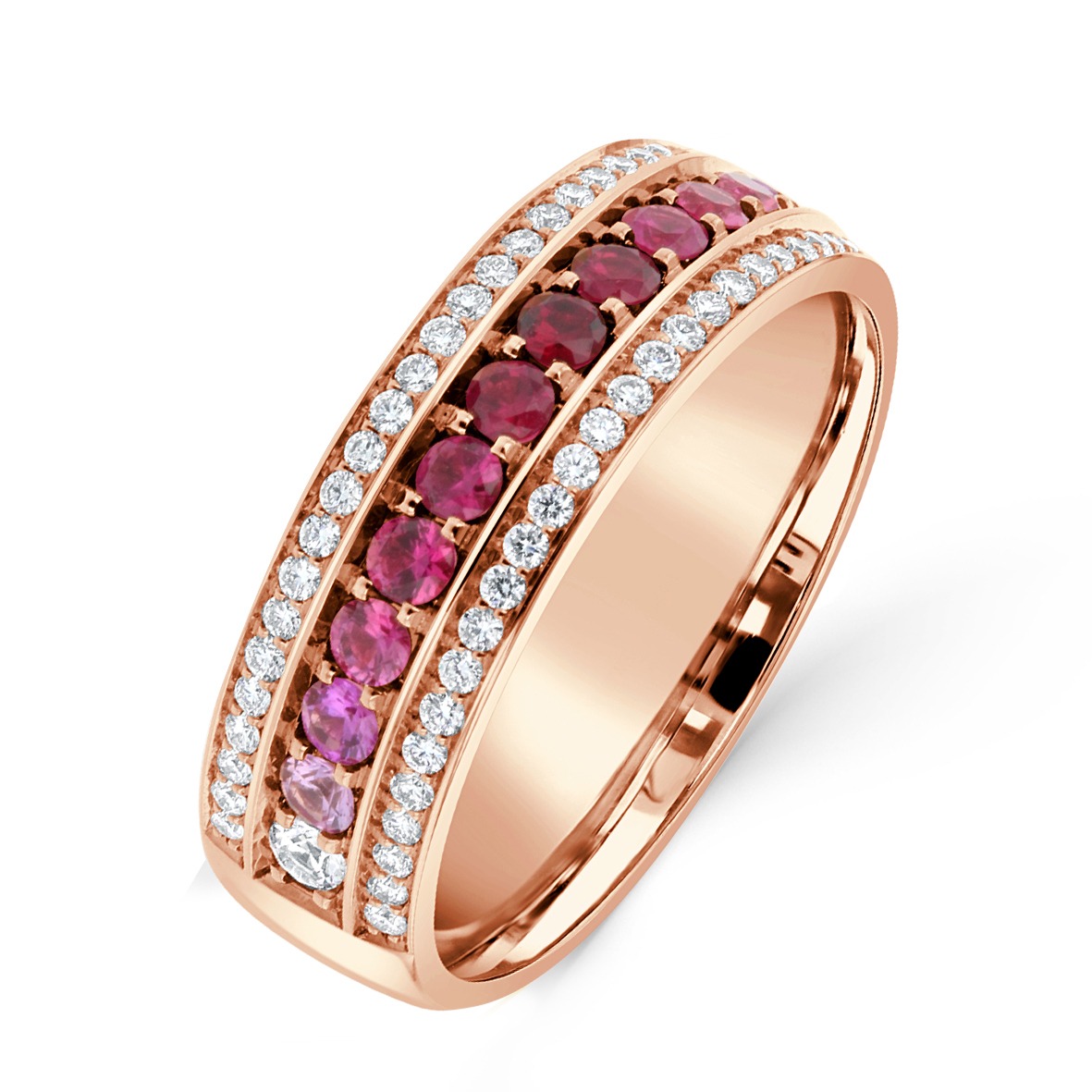 Ruby and pink sapphires (0.05ct each) ring with a beautiful fade. Set either side with 60 x .005ct white diamonds.