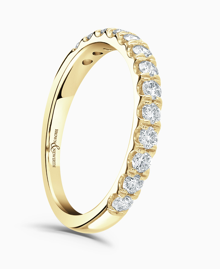Handcrafted by Brown & Newirth; open set round brilliant diamonds set in split claw across 45% of this soft, courted band. Total carat weight 0.50ct. Part of our in stock range, available in platinum & 18ct yellow gold.