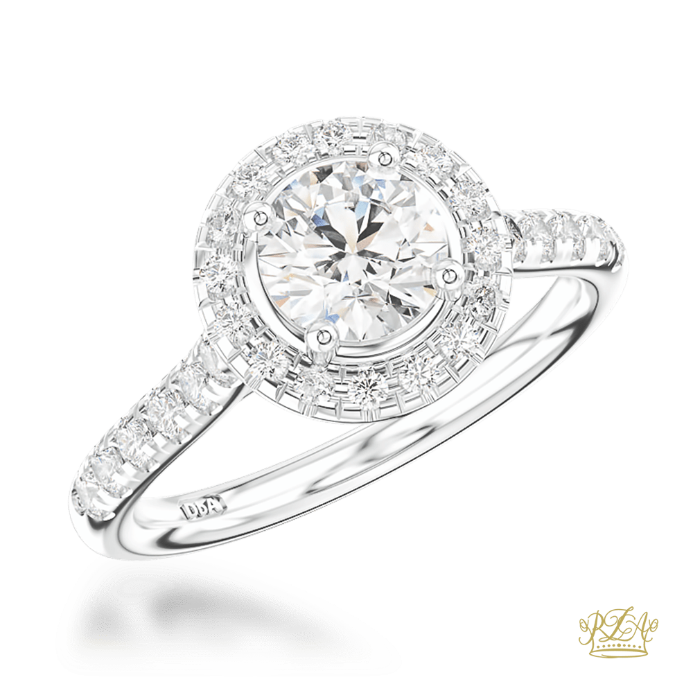 A Round cut Diamond and Diamond Cluster surrounded by smaller round brilliant cut diamonds on a Platinum Diamond Band. In a classic scalloped Skye setting