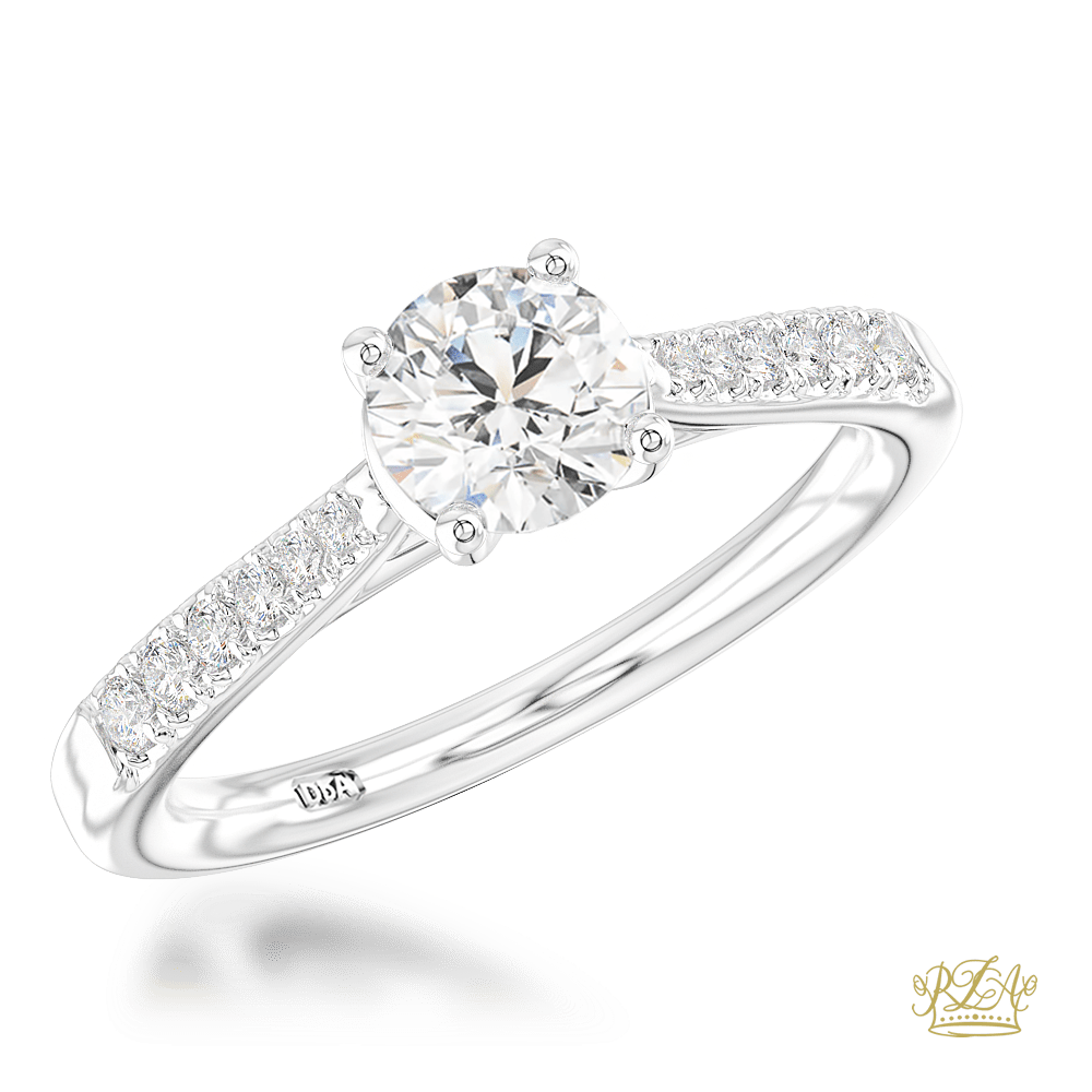 Round cut Diamond engagement ring with scalloped set diamond shoulders. In a Platinum Claw Set
