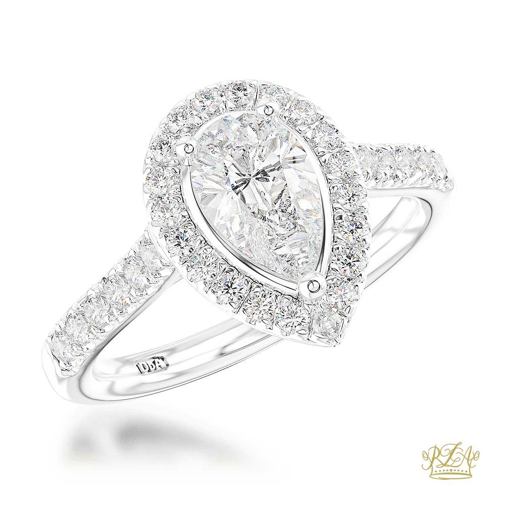 A Pear cut Diamond and Diamond Cluster surrounded by smaller round brilliant cut diamonds on a Platinum Diamond Band. In a classic scalloped Skye Pear setting