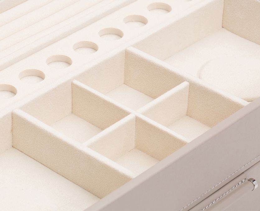 - Storage: 12 round charm storage spaces, 2 bracelet wells, 1 long necklace/bracelet compartment, 10 open storage compartments, 1 empty drawer, 4 ring rolls