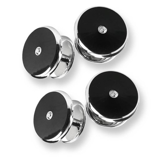 Vitreous Enamel on Sterling Silver Round Shirt Studs -Black. Set with White Sapphires.