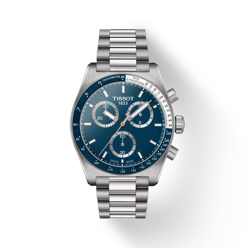 Tissot PR516 Chronograph Quartz: a contemporary take on a cherished 1970 design. With a sleek 40mm stainless-steel case and a dynamic dial, this watch embodies the spirit of speed and precision. Its Quartz G10.212 Powerdrive movement offers unmatched accuracy for an the active lifestyle. The bezel features a practical tachymeter, while Super-LumiNova®️-coated indices ensure visibility in all conditions. Its versatile design is complemented by a domed stainless-steel bracelet with a quick interchangeable system, perfect for transitioning from business meetings to casual outings. The PR516 Chronograph Quartz is a modern classic, blending in Tissot’s rich heritage. Discover this 40mm chronograph with its blue dial, matching counters and bezel and stainless steel bracelet, for a sporty and elegant look.