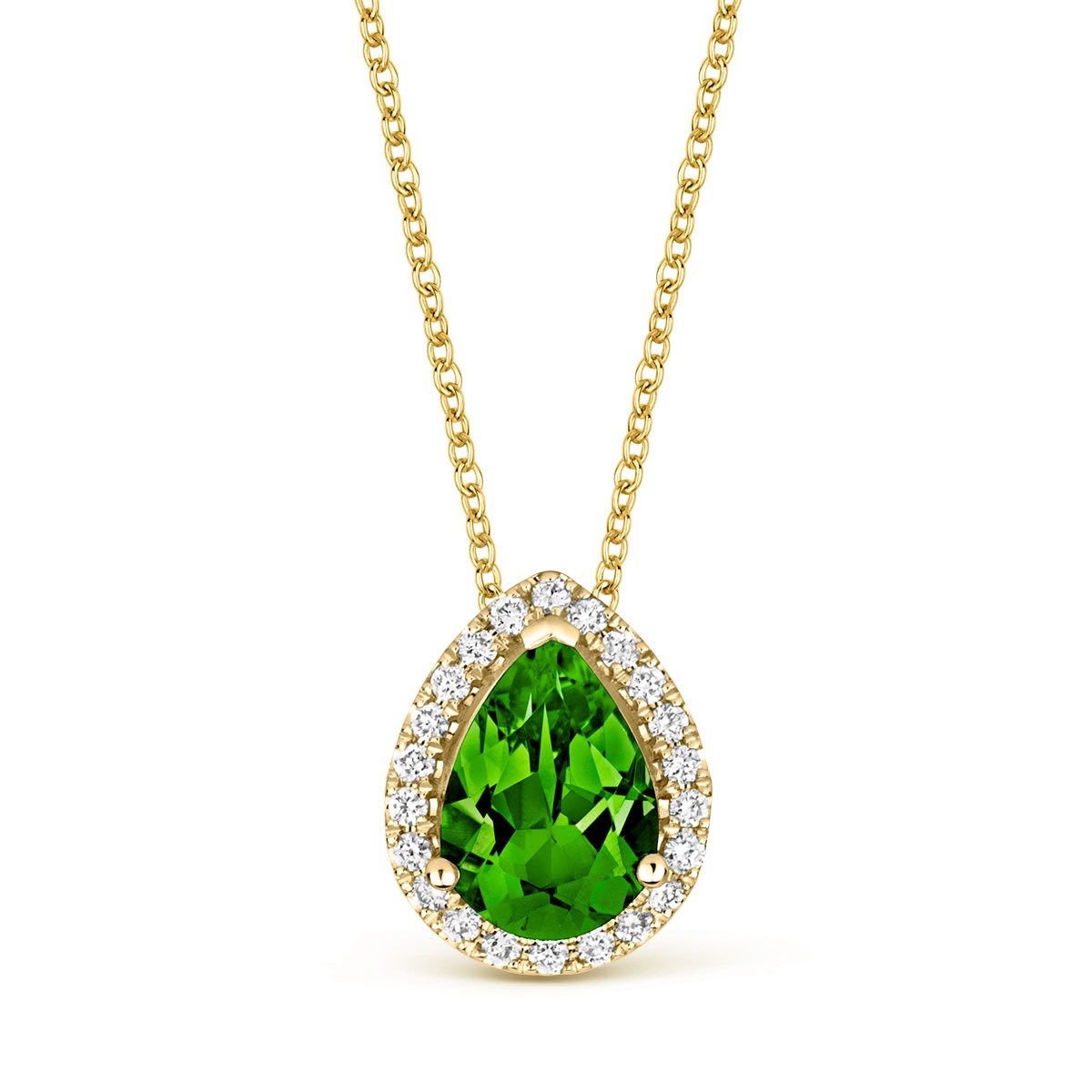A classic & contemporary pendant set with fine diamonds & a pear-cut Peridot gemstone in 18k Yellow Gold.