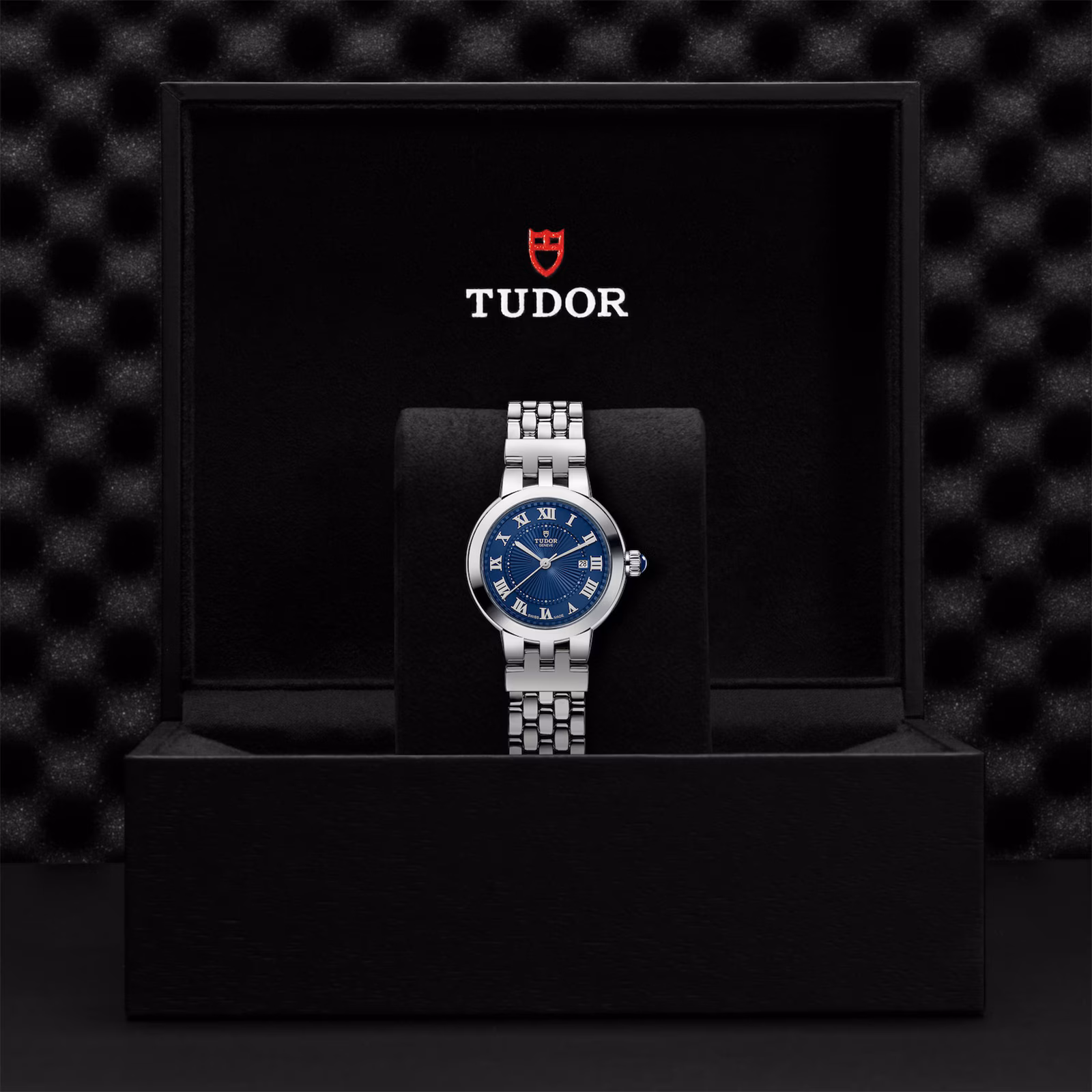 - Winding Crown – Steel screw-down winding crown, with transparent blue spinel cabochon