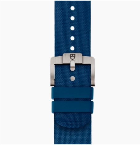 - Additional Bracelet – Additional navy blue rubber strap with woven motif and titanium buckle, included in the box