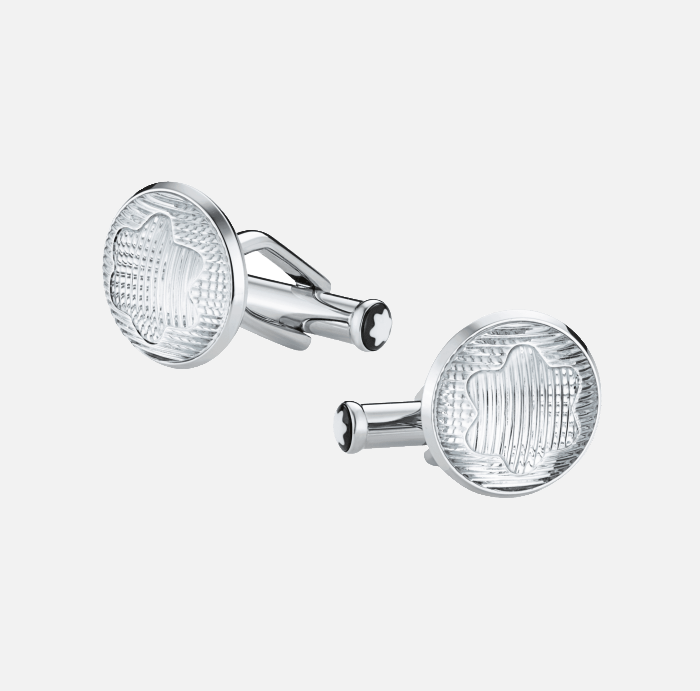 - Round cuff links made of polished stainless steel with an engraved glass inlay representing the Montblanc snowcap create a jewel with a powerful Montblanc signature.